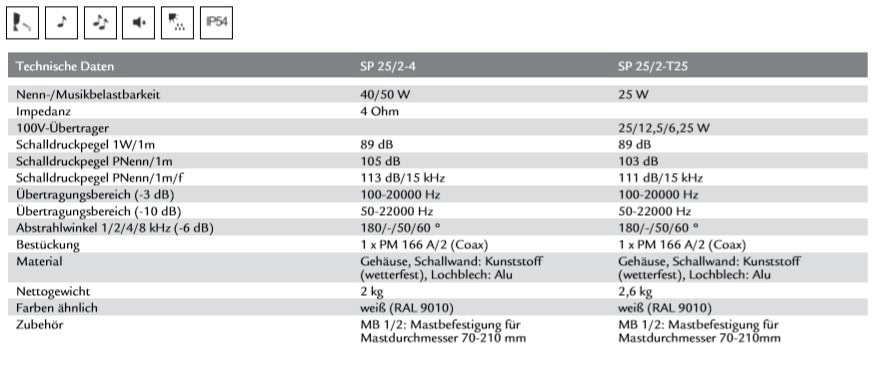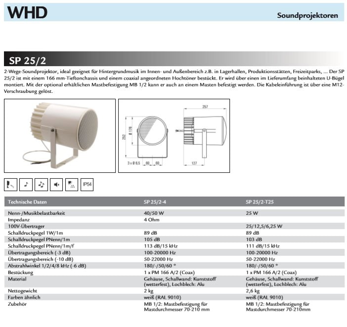 25W/100V Der professionelle 2-Wege Soundprojektor ist ideal geeignet für Hintergrundmusik im Innen- und Außenbereich, wie z.B. in Lagerhallen, Produktionsstätte, Freizeitparks usw. Der SP 25/2 ist mein einem 16mm Tieftonchassis und einem coaxial angeordneten Hochtöner bestückt. Er wird über einen im Lieferumfang beinhalteten Ü-Bügel montiert. Mit einer optional erhältlichen Mastbefestigung MB1/2 kann er auch an einem Masten befestigt werden. Die Kabeleinführung ist über eine M12-Verschraubung gelöst. Material: Gehäuse, Schallwand: Kunststoff (wetterfest) Lochblech: Alu
